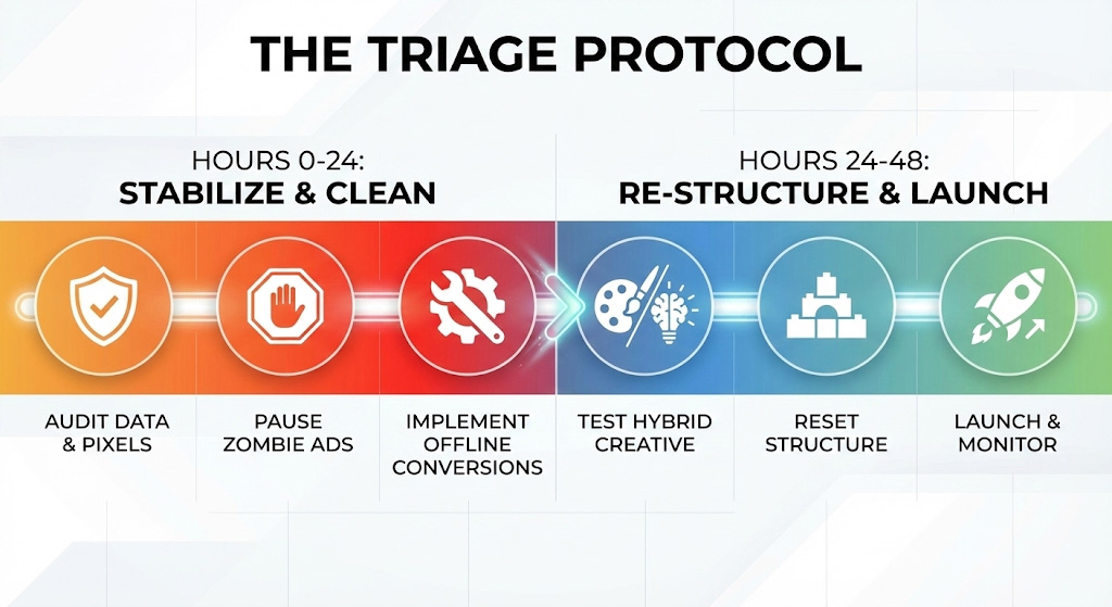 Once the audit is complete, immediate action is required. This is not a gradual optimization; it is a structural reset. The goal is to stabilize performance without triggering the dreaded “learning phase reset” that sends performance into a week-long tailspin.