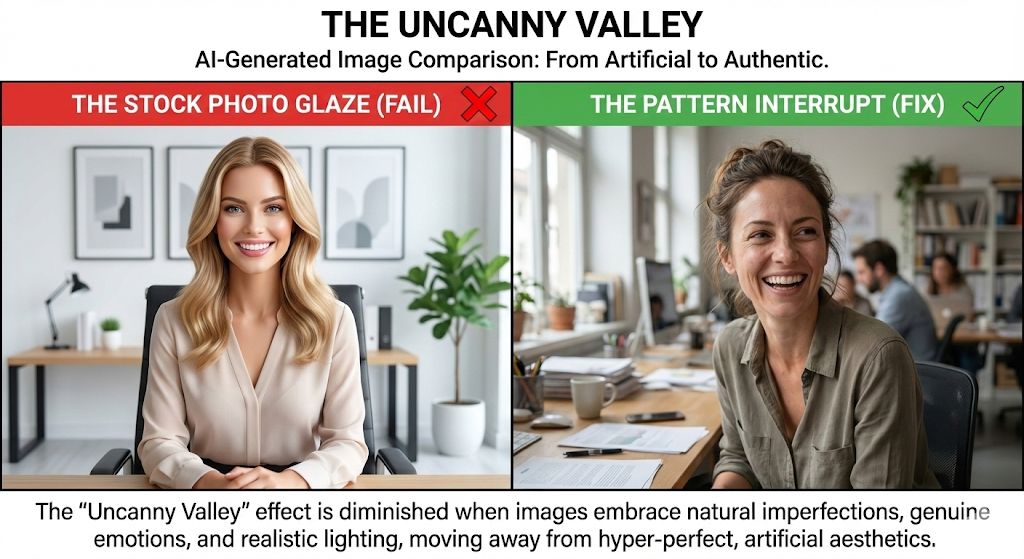 • Red Flag: Any physical impossibility breaks immersion. Also, check for the “Stock Photo Glaze”—perfect lighting, generic smiles. If it looks like a stock photo, it performs like a stock photo (poorly).